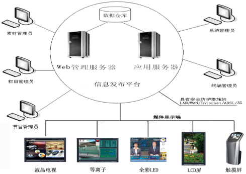 信息发布系统可以将视频、音频、图片信息和滚动字幕等多媒体信息通过网络传输到各个媒体播放端进行信息发布。系统采用开放式接口,可根据需要接入更多的复杂应用,还具有远程开机、关机、重启、运行状态监控、远程屏幕查看、远程任务文件分发、临时任务插入和播放,软件安装、系统更新等功能。